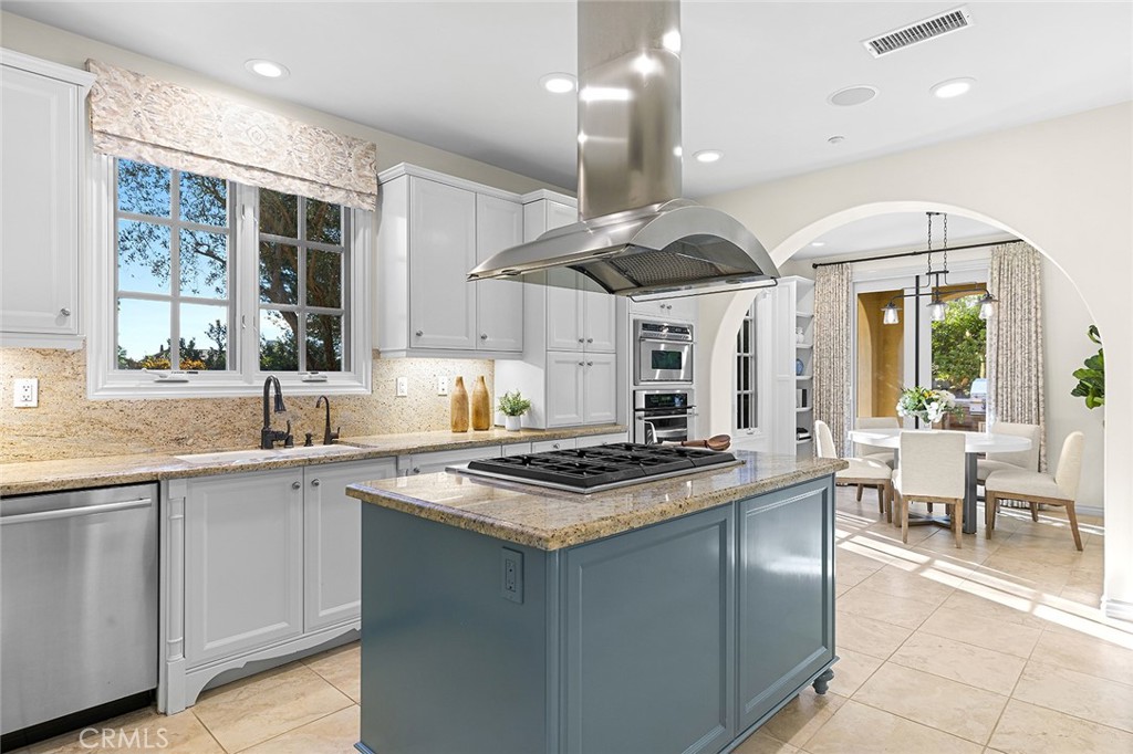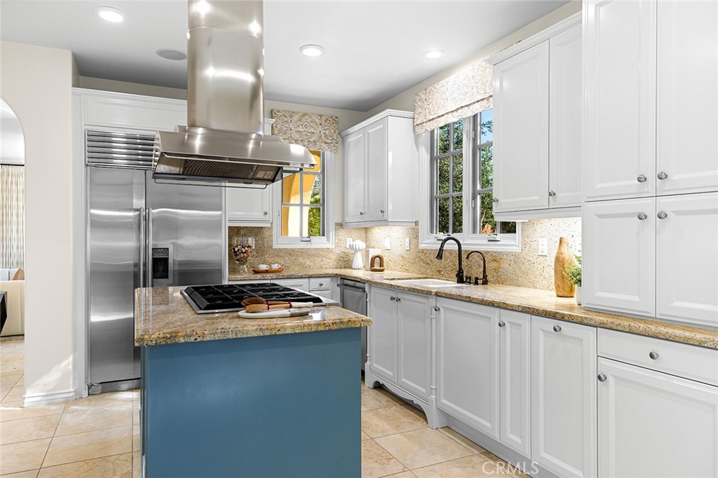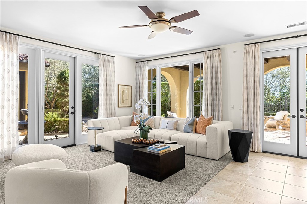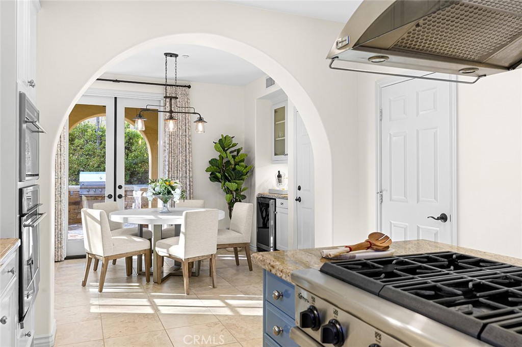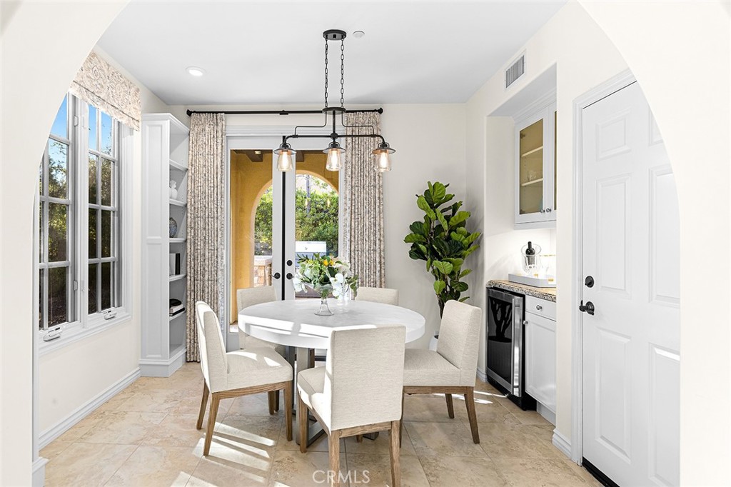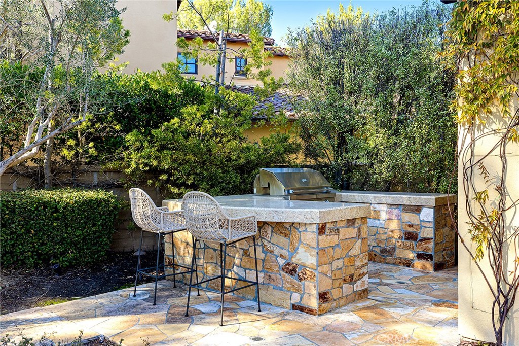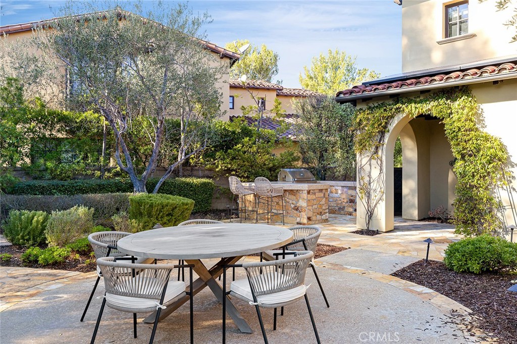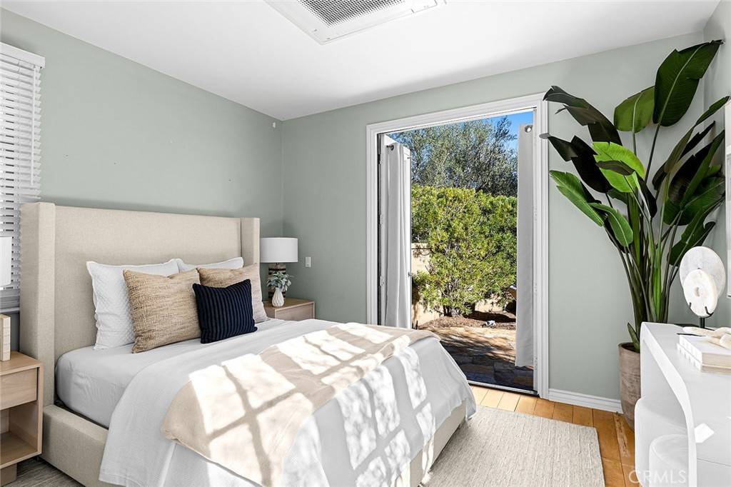 Seamlessly connecting the indoor and outdoor spaces are sets of French doors. The cozy casita serves as a perfect retreat for guests, featuring its own bedroom, bathroom, and secluded outdoor seating with a fountain. The property is equipped with energy-saving leased solar panels.